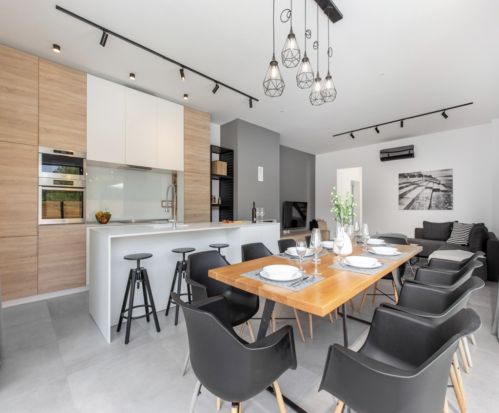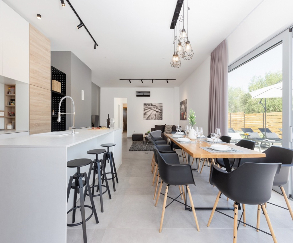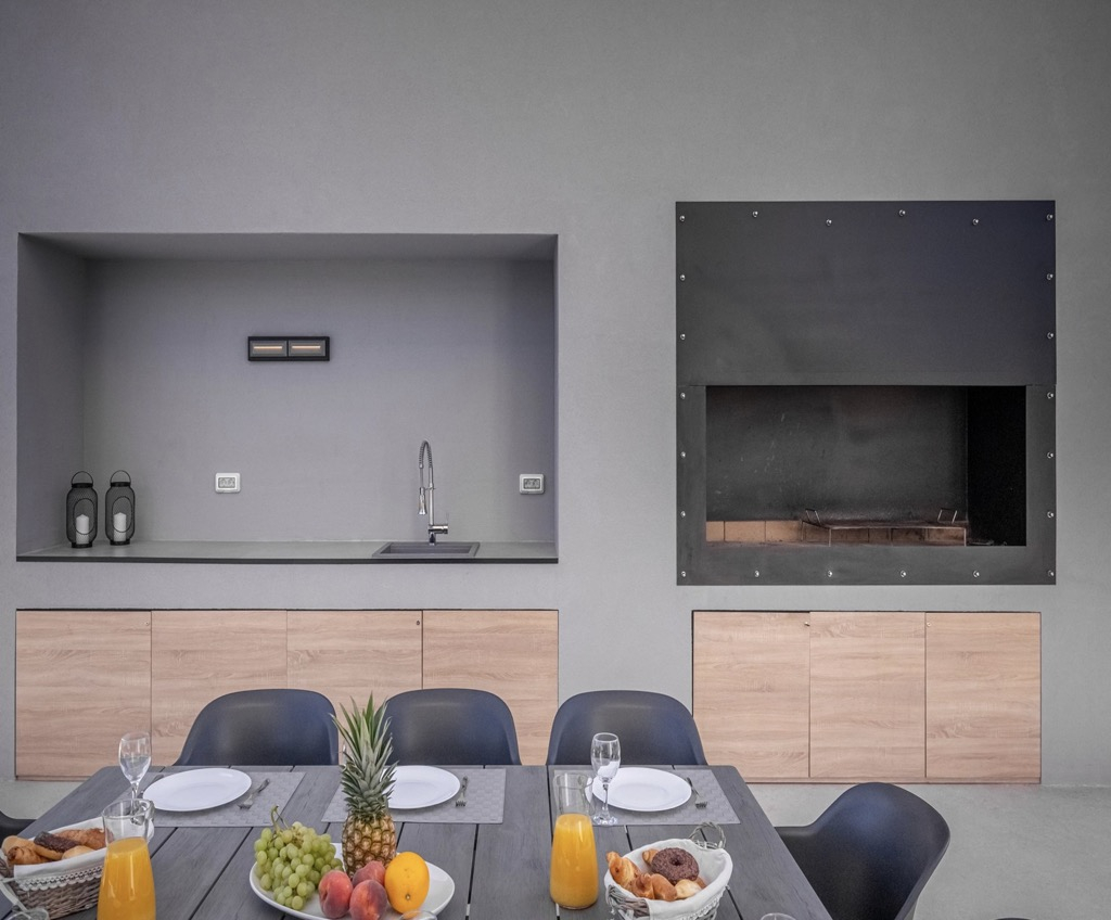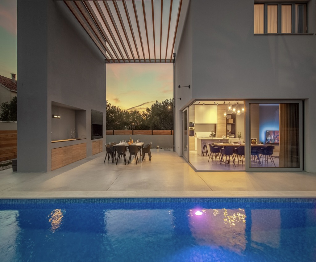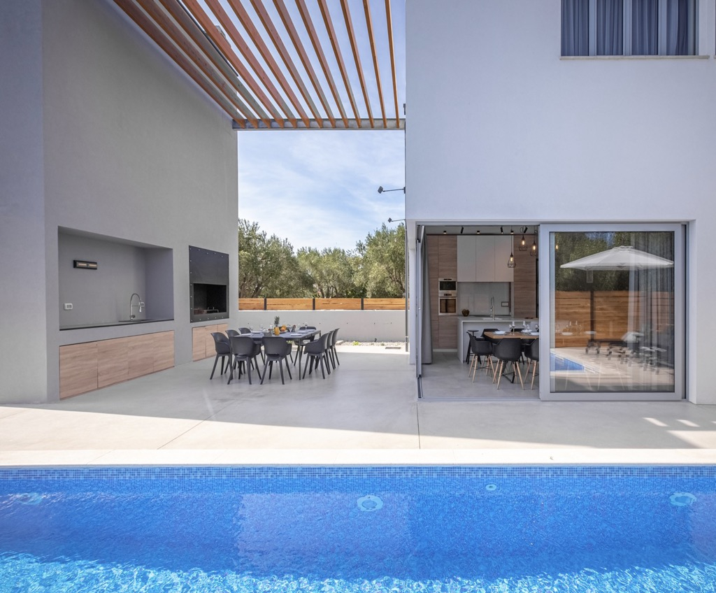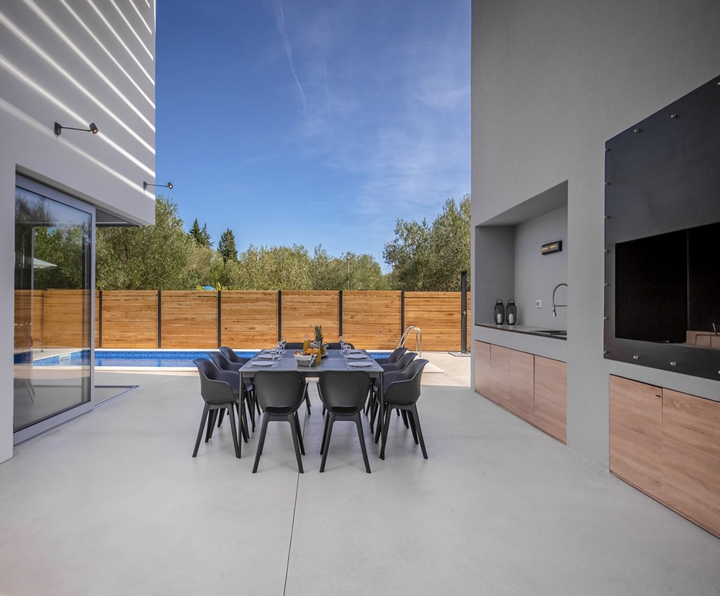 Outside, we have a spacious terrace with a seating area and a state-of-the-art outdoor kitchen, followed by a large swimming pool that emphasizes the whole atmosphere and makes it even more luxurious.